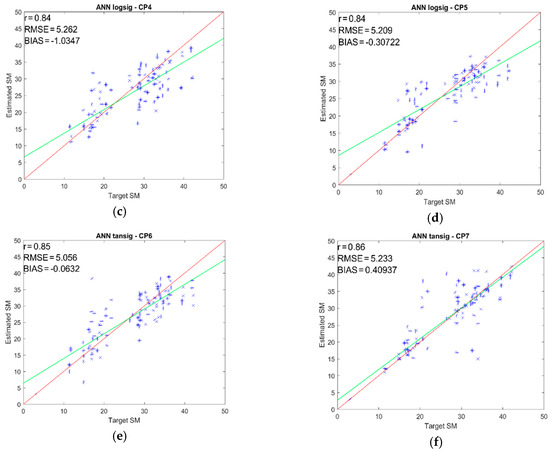 The scatterplots of the ANN estimated vs. target SMC on the validation set for the combinations CP2–CP7 are shown in Figure 7a–f, while the results for the 2pol and 3pol configurations are shown in Figure 8a,b. The information on the “best” transfer function used, depending on the systematic ANN optimization described in Section 4 is also reported in the plots.