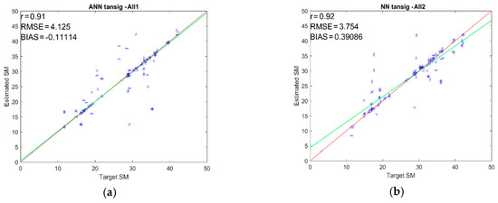 ANN estimated vs. in situ SMC for the two different combinations of input σ° + CP: (a) All1 and (b) All2.