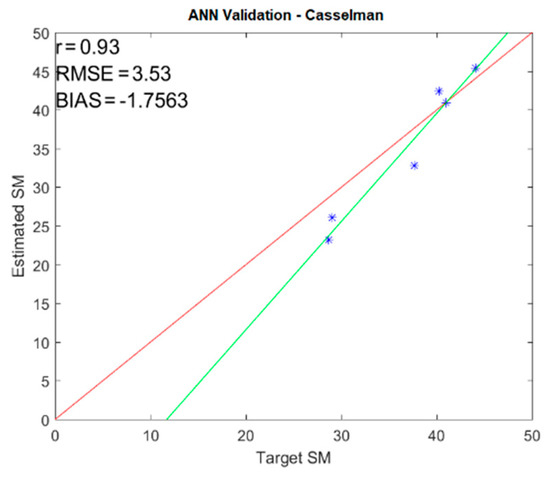 The ANN algorithm, trained and validated on Carman data, has been applied to the data collected on the Casselman test area, for which in situ SMC data were available from four RISMA stations. The obtained scatterplot from the implementation of the algorithm using the ANN All2 (σ° + CP) is shown in Figure 10. Unfortunately, the dataset was small (six points only, since two stations fall out of the June image), and therefore the statistical significance of the test was poor. However, the result seemed to be suggesting that the algorithm trained with Carman data could be applied to another test site (Casselman), which was not used for training the algorithm. The algorithm achieved a high correlation between measured and retrieved SMC equal to 0.93 with a small RMSE equal to 3.5%.