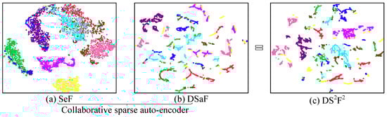 Visualization of features before and after collaborative fusion by t-SNE [33]: (a) raw spectral feature (SeF) (b) deep spatial feature (DSaF), and (c) deep spectral–spatial fusion feature (DSF). Take the University of Pavia dataset as example.