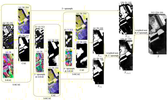 Besides, we still use the last three convolution modules in VGG-16 network to extract multiscale DSaFs and do spectral–spatial fusion by S-RCAE in each scale. Finally, we get the highly discriminant spectral–spatial features through the multiscale weighting fusion. Let , , be spectral–spatial features obtained from the three scales, pool5, pool4, and pool3, respectively. Thus, the weighting fusion of them can be represented as