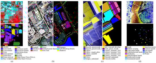 Pseudo-color and ground references for the following datasets. (a) Indian Pines; (b) University of Pavia; (c) Salinas; (d) KSC.