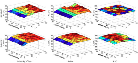 We chose the number of superpixel clusters in the range from 10 to 80, weight coefficient from 0 to 30, and analyze the two parameters simultaneously here. Since the size of Indian Pines data is too small after downsampling, and the over-segmentation is extremely unbalanced when the number of clusters over 30. Therefore, this group of parameter analysis is primarily conducted on the other three datasets. To further illustrate the parameter robustness, we do the dimension reduction of DSaF by S-RAE under different parameters at the pool5 and pool3 layer of VGG-16, respectively. Then, the processed features are upsampled by corresponding scales, and classified by SVM. The experimental results are shown in Figure 5, and features extracted at different layers are annotated as S-RAE-P5 and S-RAE-P3, respectively. As seen from the results, S-RAE achieves relatively stable classification accuracy when the value of is greater than 15, and there is no significant influence when the number of clusters is set between 10 and 80. Therefore, we set the number of clusters at 60 and the regular parameter in all experiments, except for Indian Pines data with 30 clusters.