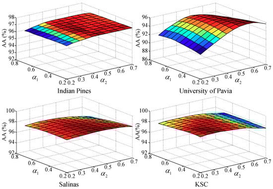 We further examine how the proposed MS-RCAE behaves when the weighting parameters and in Equation (32) change from 0.2 to 0.7. As the results shown in Figure 6, images with finer spatial texture will be more beneficial to the shallow local feature descriptor, while those with smooth distribution but complex semantic information can be more inclined to the deep global descriptor, such as the University of Pavia data benefits from a larger weight on features from pool4, Salinas and KSC data prefer to pool5, while Indian Pine depends equally on the three scale layers. Thus, we set for Indian Pine, , for University of Pavia, for Salinas and KSC, respectively.