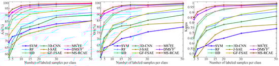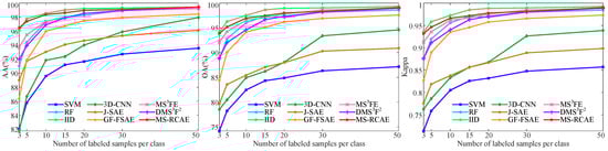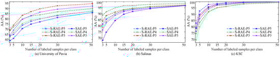 The main innovation in this paper is S-RAE for more discriminative feature learning. In order to verify its effectiveness, we severally compare the classification accuracy of DSaF processed by S-RAE and SAE, as well as deep spectral–spatial fusion feature by S-RCAE and CAE in [32], respectively. All experiments here are conducted on three experimental datasets except Indian Pines. To enhance the persuasiveness, we present the results of an increasing number of training samples from 3 to 50.