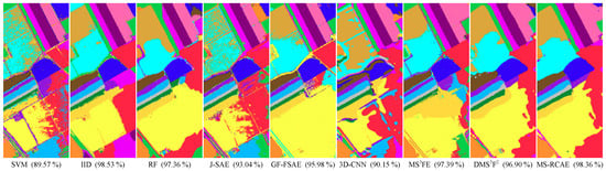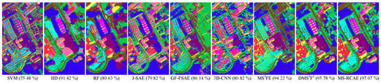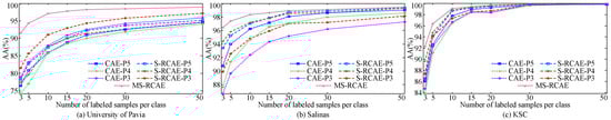 In addition, we further demonstrate the superiority of S-RAE from comparison of the spectral–spatial fusion features extracted by S-RCAE and CAE in [32]. Here, we also do the experiment on three scale layers, which are named as S-RCAE-P5, S-RCAE-P4, S-RCAE-P3, and correspondingly compared with CAE-P5, CAE-P4, CAE-P3, as well as the final method MS-RCAE. From the experimental results as in Figure 8, we can conclude that modification of DSaF by S-RAE could assist the collaborative network more effectively learning commonalities between spatial and spectral features in each scale, and excellently enhancing discriminability and robustness of learned features, such as more precise classification accuracy with a few training samples. Meanwhile, weighting fusion of multiscale features further improves their classification accuracy, particularly outstanding on University of Pavia dataset.