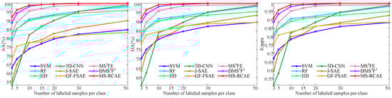Figure 4 shows the pseudocolor image and corresponding ground truth of those datasets, respectively. To evaluate the proposed MS-RCAE method qualitatively, we select support vector machine (SVM) [36] as classifier for all the feature learning-based method, and use linear kernel function with penalty factor uniformly equal to 10. Overall accuracy (OA), average accuracy (AA), and Kappa coefficient are adopted to statistical evaluation of the results. All experiments in this paper are repeated 20 times with randomly selected train samples from the labeled pixels in each dataset, and we report the average accuracy across the 20 folds.