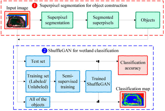 The general procedure of the proposed method is illustrated in Figure 1, which contains two main parts: (1) Superpixel segmentation for object construction. In this step, SLIC algorithm is utilized to segment the input remote sensing image into many superpixels and objects can be subsequently extracted from the input image in accordance with the segmented superpixels. (2) ShuffleGAN for wetland classification. In this step, ShuffleGAN is trained by feeding the training set, which is comprised of both labeled and unlabeled samples. The testing set is classified by the trained ShuffleGAN so as to obtain the classification accuracy and the classification map can be finally generated by classifying all of the objects in the whole scene.