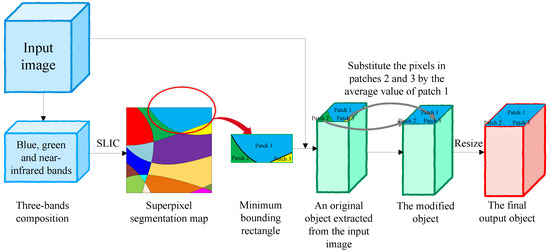 Figure 2 gives a schematic illustration of object construction. We perform SLIC-based superpixel segmentation on the three-bands composition (i.e., blue, green and near-infrared bands) of the input image to obtain the over-segmented map. The SLIC method, which is taken as an adaption of k-means clustering, has proved to be very useful for over-segmenting an RGB or gray-scale image into homogeneous superpixels. Interested readers could consult [33] therein to get a more detailed description of it. Subsequently, the minimum bounding rectangle of each superpixel is cropped to form a neighboring patch, whose size can change with the shape and size of the superpixel. The objects are then extracted from the input image based on the corresponding minimum bounding rectangle. To ensure all the neighboring pixels in the same object have the same label, those pixels, which located in an object but do not belong to the same superpixel region, are substituted by the average value of rest of the pixels within the object. Finally, the objects are resized to the same size for the convenience of training the classification model.