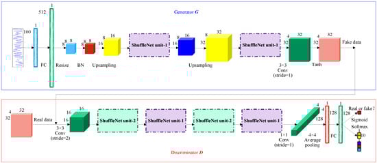 where X r e a l and G ( z ) are the real data and fake data, respectively, f ( · ) denotes the feature extraction function by joining the Conv, Shuffle units, average pooling and FC in D and E is the expectation. Based on Equation (1), the generator G is trained to match the expected value of the features on an intermediate layer of D and thus, we can prevent G from overtraining on the current discriminator.