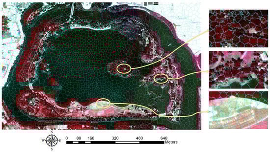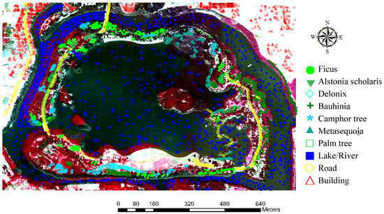 In-situ data for 10 classes of land-covers are collected for 675 points by recording Global Positioning System (GPS) points at each location. Subsequently, those points are used to manually label 4780 pixels on the dataset by remote sensing and expert biologists familiar with the Haizhu Lake. The classes and number of samples used in the experiments are displayed in Table 3, whose background color in the second column represents different classes of land-covers. Moreover, the color composite image with sampling sites is plotted in Figure 6 and the ground reference photos of different classes are shown in Figure 7.