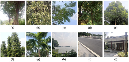 Figure 7. Ground reference photos of different classes in the study area: (a) Ficus, (b) Alstonia scholaris, (c) Delonix, (d) Bauhinia, (e) Camphor tree, (f) Metasequoia, (g) Palm tree, (h) Lake/River, (i) Road and (j) Building.