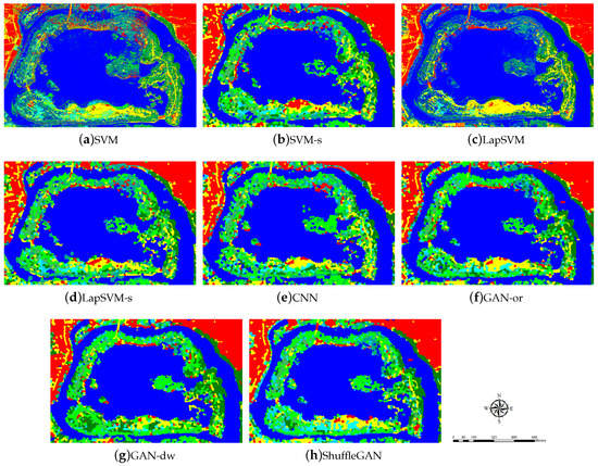 Figure 9. Classification maps of the Haizhu Lake wetland data obtained by (a) Support Vector Machine (SVM), (b) SVM-s, (c) LapSVM, (d) LapSVM-s, (e) Convolutional Neural Network (CNN), (f) GAN-or, (g) GAN-dw and (h) ShuffleGAN.