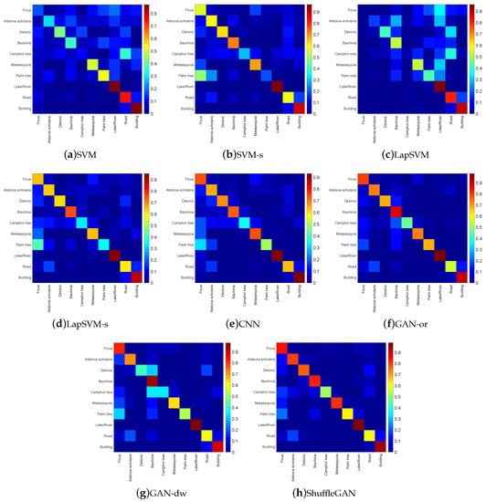 Figure 10. Normalized confusion matrices of (a) SVM, (b) SVM-s, (c) LapSVM, (d) LapSVM-s, (e) CNN, (f) GAN-or, (g) GAN-dw and (h) ShuffleGAN.