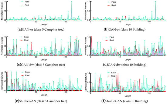 Figure 11. Normalized features of class 5 (Camphor tree) and class 10 (Building) in the real data and generated fake data obtained by various methods. (a,b) GAN-or, (c,d) GAN-dw and (e,f) ShuffleGAN.