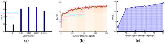 Figure 13. Impact of the (a) initial learning rate, (b) number of training epochs and (c) number of labeled training samples on the overall accuracy (OA).