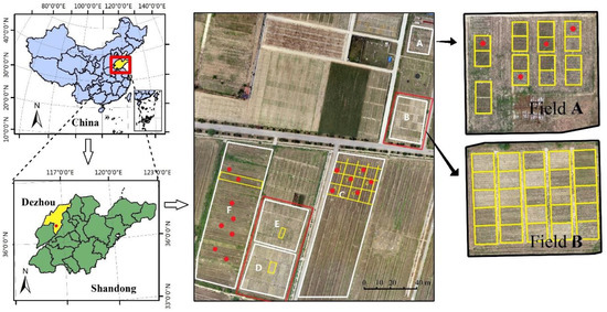 Location of Yucheng Comprehensive Experiment Station (YCES) and overview of the long-term experimental plots. (The yellow rectangles are the boundaries of plots. The red rectangles are flight coverage of the UAV hyperspectral mission; two UAV multispectral missions covered all six fields. The red spots are ground sampling plots for Fields A, C, and F in 2018).