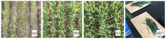 Wheat in experimental plots and wheat leaf destructive sampling for LAI measurements on 15 May 2018: (a) N0-80%fc in Field D, (b) N140-80%fc in Field, (c) N280-80%fc in Field D, and (d) Destructive sampling.