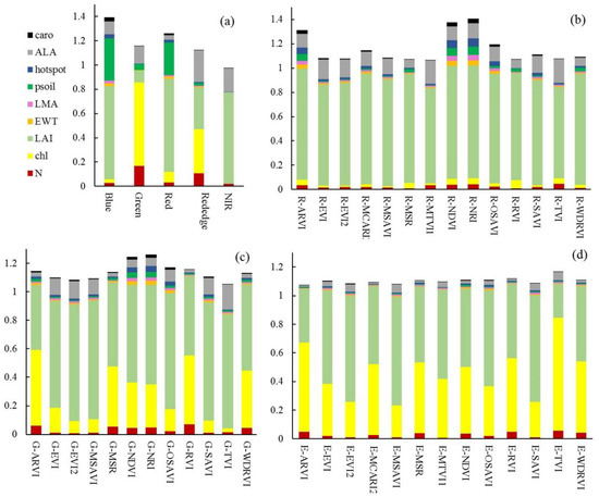 The global sensitivity analyses were conducted to select VIs for LAI retrieval. First, 5000 model input datasets (Range (EFAST), Table 6) with uniform distributions were generated using the Simlab 2.2.1 software (JRC, Italy). These generated datasets were the simulated inputs of the PROSAIL model. Second, the PROSAIL model was run in a forward mode to obtain model outputs (spectral reflectance) using the PyProSAIL package of Python 2.7 (http://teledetection.ipgp.jussieu.fr/prosail/, accessed on 24 June 2019). Then VIs (Table 7) were calculated using the PROSAIL outputs—spectral reflectance. Thirdly, datasets of the PROSAIL inputs and outputs were used to conduct the EFAST global sensitivity analysis using Simlab 2.2.1.