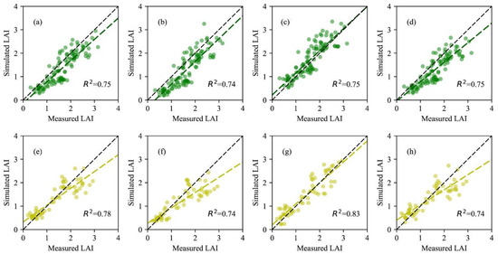 where LA (m2) represents the measured leaf area of crops harvested within each plot, nrows represents the number of rows for each plot. With UAV flights, three LAI datasets were collected for evaluation of the LAI retrieval accuracy (Table 4). Each dataset exhibited a high coefficient of variation (CV) owing to the wide range of agricultural treatments, which contributed to a good model fit between the measured and simulated LAI. Because the flight coverage of the multispectral UAV observations (all six fields) differed from that of hyperspectral UAV observations (see Figure 1 for the two red rectangles), the number of ground samples for the LAI estimation was different for 15 May 2018.