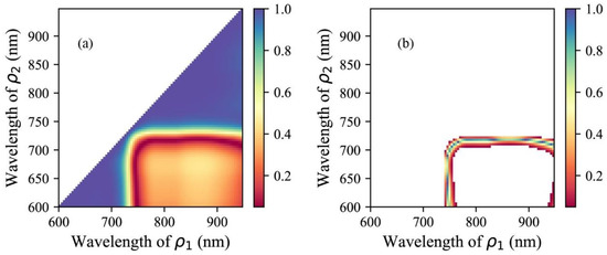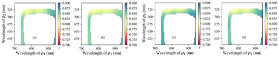 The optimal central wavelengths of the NIR and R bands were determined via three steps. First, an autocorrelation analysis was performed between any two hyperspectral bands among 88 bands (600–950 nm, Cubert S185). We set p > 0.05 to find uncorrelated bands since the p value of correlated variables was < 0.05. Second, four selected m-VIs (m-NDVI, m-MCARI2, m-ARVI, and m-NRI; see Section 3.1) were calculated from the combinations of reflectance data determined above. Third, the optimal central wavelengths were determined by the highest Pearson correlation coefficient (r values) between the calculated VIs and the measured LAI.