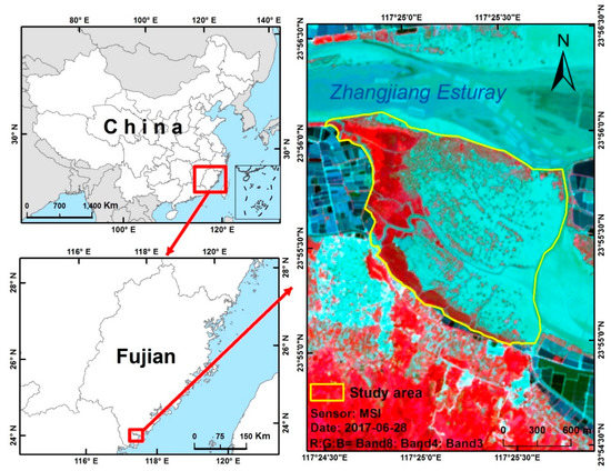 The studied mangrove forest site was the core zone of the Fujian Zhangjiangkou National Mangrove Nature Reserve (FZNNR), which has an area of 2.5 km2 and is located in the estuary of Zhangjiang River, Yunxiao County, Fujian Province, China (Figure 1). In 1992, the reserve was established by the local government, in 2003, it was approved as one of China’s National Nature Reserves, and in 2008, it was classified as a Wetland of International Importance by the Ramsar Convention (Ramsar site no. 1726). The study area is characterized by dominant species of Kandelia Obovata (KO), Aegiceras corniculatum (AC), and Avicennia marina (AM) mixed with a few Bruguiera gymnorrhiza and Acanthus ilicifolius plants. Recently, the frontier of intertidal zones was rapidly invaded by Spartina alterniflora (SA). The climate is a subtropical maritime monsoon climate. The annual average temperature is about 21.2 °C, and the hottest period lies between July and September, while winters are cold with an average temperature of 4 °C. The raining season is from April to September, the average annual precipitation is 1714 mm [20].