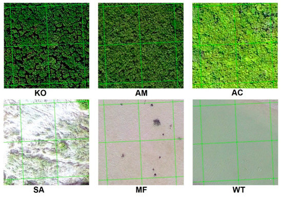 Examples of training samples selected by the adjusted fishnet and UAV images. KO: Kandelia Obovata, AC: Aegiceras corniculatum, AM: Avicennia marina, SA: Spartina alterniflora, WT: water, and MF: mudflats.