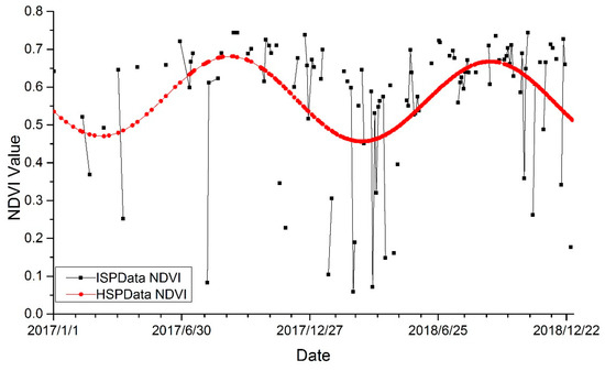 Time series Sentinel normalized difference vegetation index (NDVI) profile before (initial Sentinel phenological dataset, ISPData) and after (high-quality Sentinel phenological dataset, HSPData) the HANTS (harmonic analysis of time series) algorithm.