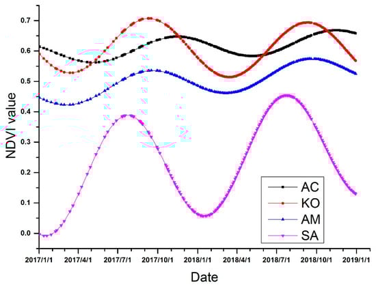 - In Zhangjiang estuary, there were mainly three types of mangrove species (AC, AM, and KO), and one type of invasive species (SA). To build the NDVI time series, we collected 199 scenes of S2 images from 1 January 2017 to 31 December 2018. After removing noise and filling gaps in the initial NDVI time series by the HANTS algorithm, we found that the phenological trajectories of AC, AM, KO, and SA showed great differences (Figure 6).