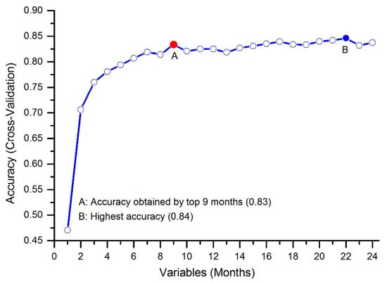 Table 2 shows the importance of the contribution of each month to the RF classification of mangrove species. The higherMDGand MDA value indicates that the corresponding month contributed more to the RF classification model. As shown in Table 2, the most influential months included April 2017, January 2017, March 2018, December 2017, February 2018, February 2017, and January 2018, with MDG values all above 10. All of the months contained valuable information for discriminating among mangrove species. However, according to the cross-validation accuracy (Figure 8), the top nine months raised the accuracy to 83% (Point A), and the top 22 months reached the highest accuracy. The month importance measure indicated that the months in late winter and early spring played critical roles in mangrove species discrimination.