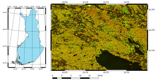 Image orthorectification was done using a digital elevation model available from the National Land Survey of Finland. Scenes were aggregated in azimuth and range to obtain images with pixel dimensions approximately corresponding to the 20 m grid spacing. The bilinear interpolation method was used for resampling in connection with the ortho-rectification. Radiometric normalization of intensity was done using a projected pixel area based approach to minimize the effect of the topography [34,35]. The scenes were further re-projected to the ERTS89/ETRS-TM35FIN projection (EPSG:3067) and resampled to a final pixel size of 16 m.
