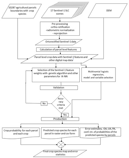 Two methods were tested keeping in mind the applicability for operational work. The improved ik-NN estimation method with a genetic algorithm feature optimization was tailored for the study with optional Sentinel-1 data sets, species groupings, and thresholds for the minimum parcel area (cf. [2]). The genetic algorithm has turned out to suit complex optimization problems. It is popular in economic and ecological phenomena and machine learning (e.g., [39]). However, it often needs fine-turning and tailoring for different applications. Multinomial logistic regression for categorical variables were tested as an optional method.The number of species groups varied from 7 to as large as 41, the latter one requested by the agricultural authorities for the Eura site. Leave-one-out cross validation and splitting the data to training data (2/3) and validation data (1/3) were used in result validation. The flowchart of the work-flow of the study is shown in Figure 3. The first analyses were conducted with both methods. Only the ik-NN method was used in the deeper analyses because it turned out to give smaller prediction errors.