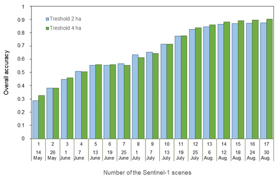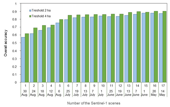 Overall accuracies as a function of the stage of the phenology and the number of scenes calculated with the minimum sizes of the parcels of two and four hectares. The time is reverse compared to Figure 4.