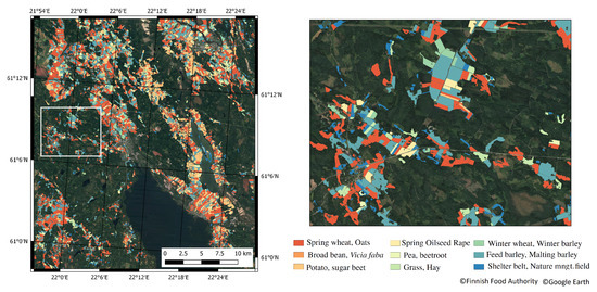 The methods were developed and the results demonstrated and discussed using one test site from southwest Finland, located in the Eura municipality (Figure 1), crop data from the test site, provided by the Finnish Food Authority [33] and seventeen 17 Sentinel-1 scenes.