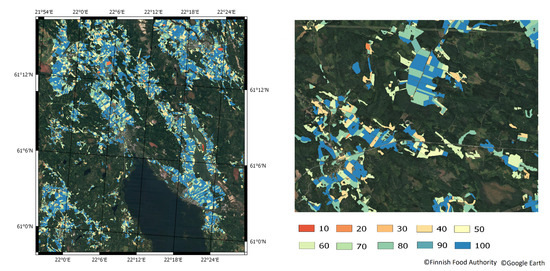 An example of a map of the predicted crop species is shown in Figure 6 and an example of the largest class probability (scale 0–100) in Figure 7 (see Section 3.3). The Sentinel-1 scenes from 1 June to 30 August have been used here, in 15 scenes total. The crop species has been predicted for all field parcels here, that is, with a minimum field parcel size of greater than zero. Still, the majority of the probabilities are large, in 90% of the parcel area larger than 50% and, in about 80%, larger than or equal to 80% (see also Table 3).