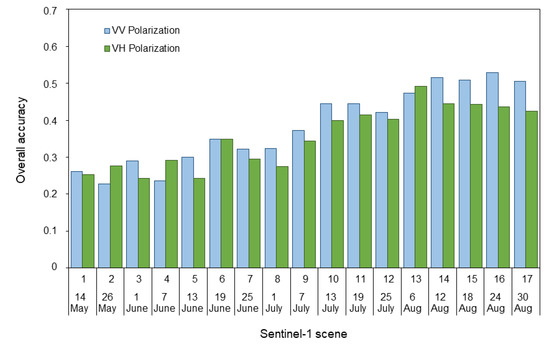 Importantly, while SAR time series have been used recently, the analyses of the effect of the precise acquisition time of the SAR data in crop species predictions has been studied less. The scenes from the late growing season had the greatest explanatory power in predicting the crop species (Figure 4 and Figure 5). The analyses separately with the VV and VH polarizations and with one Sentinel-1 scene only revealed the same thing; in addition to that, the VV polarization gave greater OAs than VH polarization in the later part of the growing season (Figure 8).