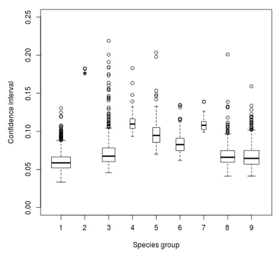 Distributions of the confidence intervals by the species groups, shown as boxplots, that is, median, 25% and 75% percentiles, 1.5 times of the interquartile ranges, and individual outliers. The width of the box is proportional to the square root of the number of the observations of the species group.
