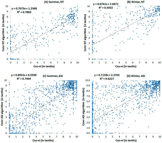 Figure 7, Figure 8 and Figure 9 show the distribution histograms of the difference between Csmr calculated by the three algorithms and Cso (Csmr–Cso) (Section 3.1), and also the difference between Csmr and Cso-ni (Csmr–Cso-ni) (Section 3.2) for the summer and winter seasons. Scatterplots of correlation between Cso and Cso-ni with Csmr are presented in Figure 10 and Figure 11. The most part of Cso observations were conducted in SIC conditions of 0–1 and 9–10 tenths (the number of pixels is shown above each SIC range in Figure 7, Figure 8 and Figure 9). Therefore, the data points in Figure 10 and Figure 11 are located mostly within the SIC ranges of 0–1 and 9–10 tenths where they massively overlap.