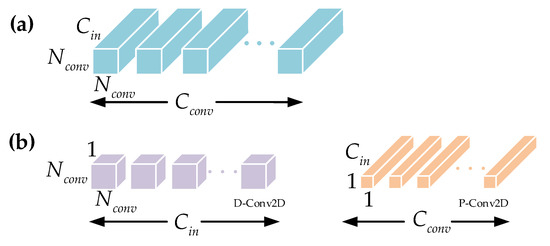Detailed internal operation flow of a DS-CNN. (a) Depthwise convolution (D-Conv2D); (b) pointwise convolution (P-Conv2D).