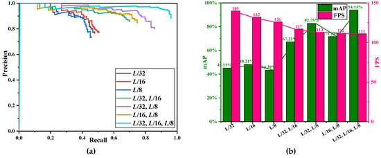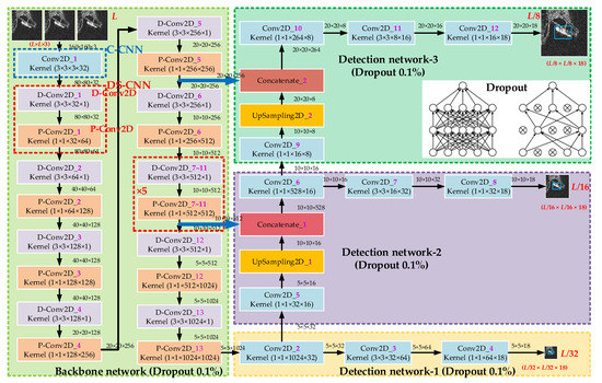 Figure 6 is the diagram of multi-scale detection. As is shown in Figure 6, for example, if the size of the input image is L × L, the size of the output feature maps are L/32 × L/32 in the detection network-1, L/16 × L/16 in the detection network-2, and L/8 × L/8 in the detection network-3. Therefore, our network will generate predictive bounding boxes based on these feature maps. By using multi-scale mechanism, the detection accuracy can be greatly improved. Detailed research of multi-scale detection will be introduced in Section 5.4.3.