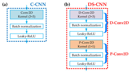 Figure 5a,b respectively shows the internal implementation of a C-CNN and a DS-CNN in detail. From Figure 5a, the C-CNN only carries out a Conv2D operation, then passes through batch normalization (BN) layer, and finally enters into the activation function Leaky-ReLU layer to obtain the output of the C-CNN. From Figure 5b, the DS-CNN carries out D-Conv2D operation first, then passes through BN layer, and finally enters into the Leaky-ReLU layer to obtain the output of the D-Conv2D. After that, the output of the D-Conv2D layer is inputted into the P-Conv2D layer. P-Conv2D carries out a pointwise convolution operation, then passes through batch normalization (BN) layer, and finally enters into the activation function Leaky-ReLU layer to obtain the output of the P-Conv2D. The output of the P-Conv2D is that of the DS-CNN.