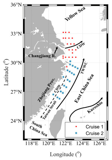 Location map showing the in-situ sampling stations for the two cruises. TWWC: Taiwan Warm Current; CDW: Changjiang Diluted Water, with the solid line for the summer and spring seasons and the dash line for the winter and autumn seasons.