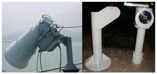 Shipborne radiometric measurement setup. (a) L-band polarimetric radiometer and (b) stabilized platform for amounting the radiometer.