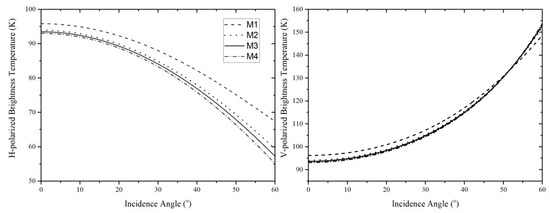 It is known that the prediction discrepancies of the different sea surface emission models (especially, TSM model and empirical model of [25]) are quite significant for SSS retrieval. For the TSM model, the choice of the cutoff wavenumber and the factor a0 can affect the prediction of brightness temperature significantly. The a0 value is always assumed to vary from 0.004 to 0.008, and in some studies, the DV spectrum is multiplied with a factor of 2 [16,32,44]. In this paper, the TSM model with four typical combinations of factors was used to predict the brightness temperature and compare with the in-situ measured data, and the choices of the factor and a0 values are shown in Table 2. The influence of different factor and a0 values on the predicted brightness temperature is shown in Figure 5, in which the SST and SSS were fixed as 15 °C and 35 psu, and the cutoff wavenumber was set as . Clearly, the predicted brightness temperature obtained from the model M1 (DV spectrum multiplied with the factor 2, hereafter DV2) is higher than those from the models M2, M3 and M4, especially for the horizontal polarization component. Comparing to vertical polarization, the horizontal polarization is sensitive to the wave spectrum, and the differences among the models M1, M2, M3 and M4 can reach up to 2 K at nadir, and increase to 10 K with an incidence angle at 60°, which is too large for SSS retrieval. The differences between the models M1, M2, M3 and M4 are less than 2 K for vertical polarization, which is reasonable because the vertical polarized brightness temperature is less influenced by the sea surface roughness effect. Although the differences are small for vertical polarization, it is still too large for SSS retrieval. Thus, these factors need to be determined by fitting the model predictions to the in-situ measurements. On the other hand, due to the limited brightness temperature measurements in coastal waters of China, the regional bias of the empirical model in the ECS is still unclear and needs to be examined.