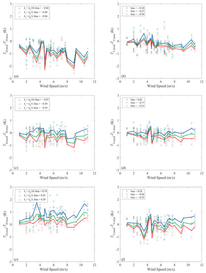 The errors in the predicted brightness temperatures from the TSM model using different a0 and cutoff wavenumbers, solid lines represent for mean value at different wind speed. (a,b) results with a0 = 0.004. (c,d) results with a0 = 0.006. (e,f) results with a0 = 0.008. kc: cutoff wavenumber; k0: wavenumber of L-band electromagnetic wave.