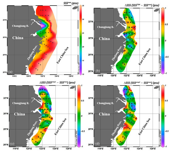 Spatial distribution of measured SSS and errors of retrieved SSS using the different emission models. Interpolations were done by the Ocean Data View software.