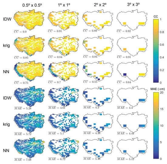 Interpolation evaluation maps: correlation coefficient (CC, 1st–3rd rows) and mean absolute errors (MAE, 4th–6th rows) at the interpolated pixels using three methods of interpolation: the inverse distance weighting (IDW), kriging (krig), and nearest neighbor (NN). Average values are shown in the upper left corner of each map.
