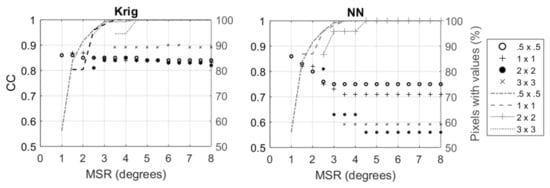 The interpolation results in Figure 3 were obtained by setting the maximum search radius (MSR) varying from 3.5° to 4.5°, depending on the grid resolution, and a minimum of three pixels with VS within that radius. To test how the search radius affects the interpolation, we calculated the mean CC resulting from the kriging and NN interpolation as such radius increases. This analysis is necessary because the quality of the estimates decreases as MSR increases, but setting a small MSR means neglecting pixels near the basin boundary. Because the results from IDW and kriging methods were similar, Figure 4 shows the plots for kriging and nearest neighbor (NN) methods only. We noted that, using kriging (and IDW), correlation is above 0.8 for all MSR and about 100% of pixels were filled with MSR ≥4.5° for 3° spatial resolution and MSR ≥3° for finer spatial resolutions. For the NN method, the gain of spatial coverage comes with a high cost to the quality: CC decreases faster than that using kriging as MSR increases, with CC falling below 0.8 for MSR ≥2.5° and 10% of empty pixels (Figure 3). Based on that evaluation, we limited the search radius at 3.5° for the 0.5° grid, 4° for the 1° grid, and 4.5° for 2° and 3° grids.