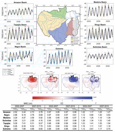 We aggregated all altimetry-based TWS estimates (TWSreg + TWSinterp) and averaged the final product (TWSalt) over the Amazon River basin and basins of its main tributaries. Among the droughts and floods that have occurred in the region, we selected two extreme events, one during the dry season (MAM 2004) and one wet (DJF 2009), that covered practically the same area extent in the northern part of the Amazon Basin (Figure 5). The time series for such ‘extreme’ area are shown in Figure 5, as well as selected metrics (MAE, CC and γ) between TWSGC and TWSalt for each basin and resolution.