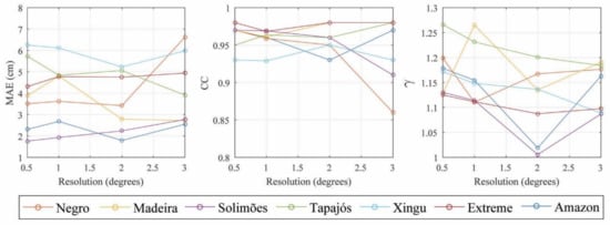 Except for Xingu at 0.5 and 1°, and Negro at 3°, MAE between TWSalt and TWSGC time series was below 6 cm. With a few exceptions, CC was above 0.95 for all resolutions and basins. The lowest CC was found for the Negro River basin at 3°. At 3° and compared to other basins, TWSalt for the Negro River basin was not as well represented: MAE >6cm and CC <0.9. This limitation is linked to the fact that, at such resolution, two among the few pixels in the Negro River basin have low CC between RA and TWSGC (see Figure 1). For finer resolutions, the number of well correlated virtual stations is higher, enhancing the quality of our estimates in that basin. The standard deviation ratio (γ) was the only metric with a similar (negative) trend among the analyzed cases, i.e., it decreased for all sub-basins as the spatial resolution degrades. Regardless of the basins and spatial resolution, γ > 1 show that the amplitude of TWSalt signal is greater than that from TWSGC. In most basins, γ decreases as spatial resolution degrades from 1° to 2°. At 3°, γ converged to a range between 1.5 and 1.2 for the Amazon, Madeira, Negro and Tapajós basins, and below 1.1 for Extreme, Solimões and Xingu River basins.